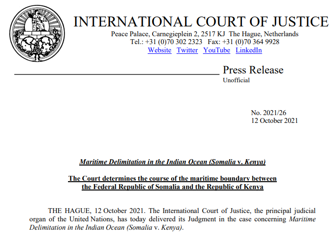 KENYAPresident Uhuru Kenyatta has issued a statement on the judgment made by the International Court of Justice ICJ on the maritime border dispute between Kenya and Somalia. October 12 2021. Press release 202122 24 September 2021 Maritime Delimitation in the Indian Ocean Somalia v.