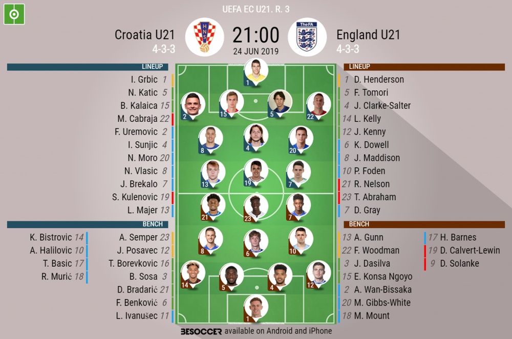 Match ends Croatia U21 1 England U21 2. Croatia U21 vs England U21. Englands chances of reaching the knockout round of the U21.